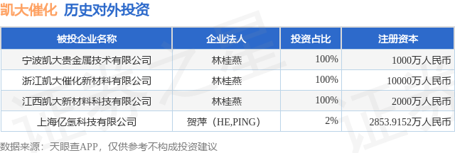 本站消息,根据天眼查APP显示,凯大催化(920974.BJ)新增一起对外投资事件,被投资公司为宁波凯大贵金属技术有限公司,法定代表人林桂燕,投资占比为100%。该公司从事批发业鼎牛网,注册资本为1000万人民币。目前,凯大催化共存在对外投资4项,详见下表: